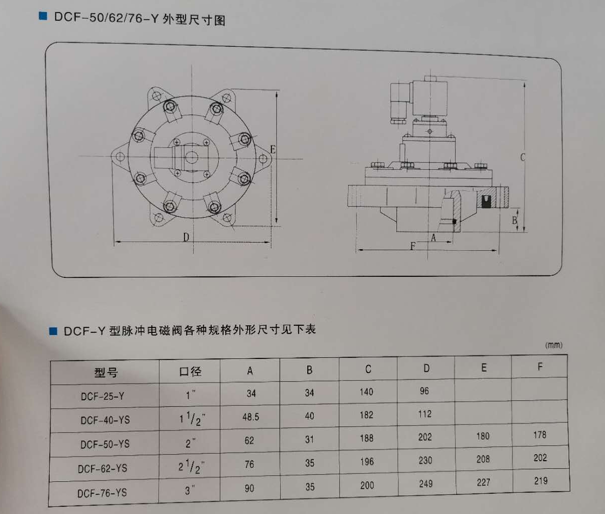 ??DCF-20/25/40/50/62/76-Y型系列型脈沖電磁閥為淹沒式閥(亦稱嵌入式閥),是袋式除塵器噴吹清灰主要裝置,向濾袋內(nèi)噴吹壓縮空氣開關(guān),受脈沖控制器輸出信號控制,對濾袋輪流噴吹清灰周期性工作,以保證除塵器達到收塵效率,它直接按裝在氣包上,有更好直通噴吹清灰效能。適用于氣源壓力范圍較寬場合。